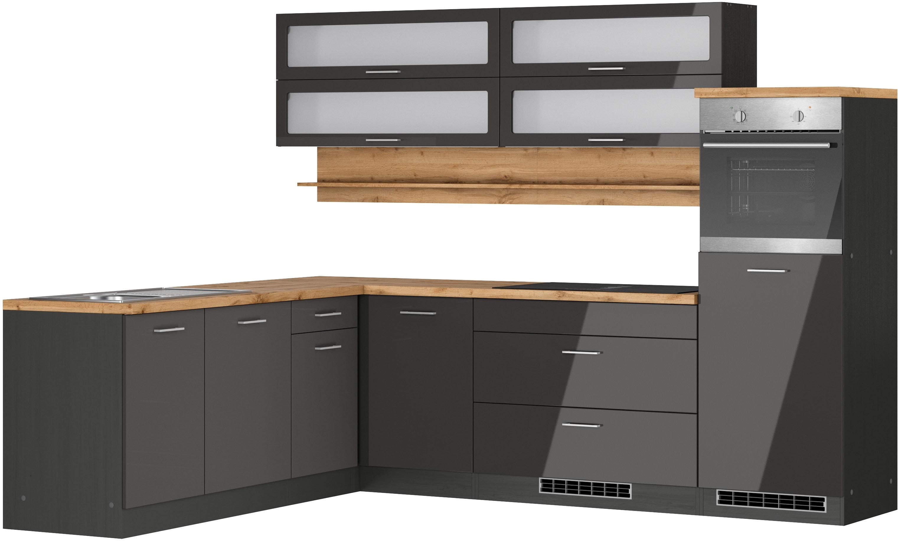 Winkelküche KOCHSTATION "KS-Milan, optional mit Muldenlüfter", grau (küche: grau, front: grau hochglanz, korpus: grafitgrau, arbeitsplatte: wotaneichefarben), B:270cm H:166cm T:60cm, Komplettküchen-Sets, Stellbr.270/220 cm, wahlweise mit E-Geräten, K...