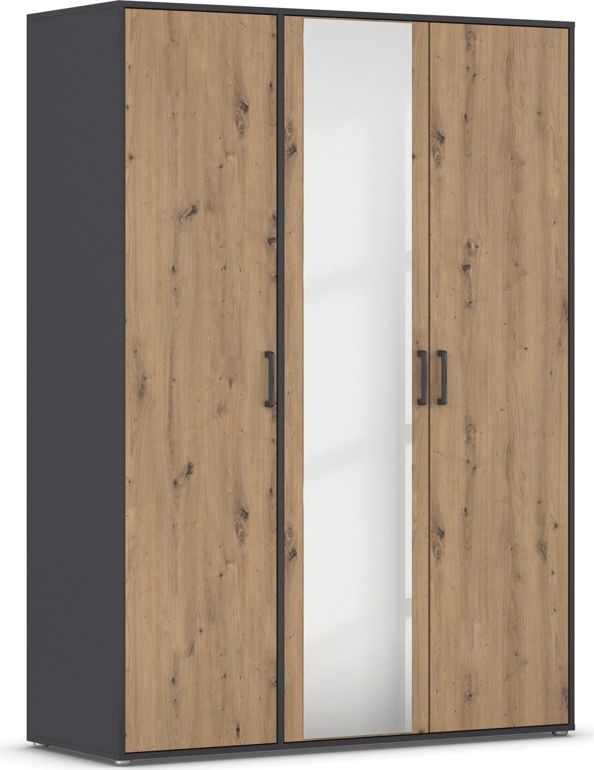 Drehtürenschrank RAUCH "Kleiderschrank Schrank Garderobe Wäscheschrank VOYAGER", grau (graumetallic, eiche artisan), B:140cm H:194cm T:53cm, Holzwerkstoff, Schränke, Drehtürenschrank, mit modernen Griffen in Graumetallic und Spiegel